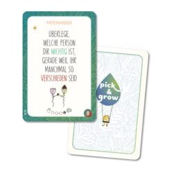 Mit lebensnahen Aufgaben aus den Bereichen Kommunikation, Gesunder Geist, Zeitmanagement, Miteinander und Entdecken lernst du, spielerisch dein Potenzial voll auszuschöpfen. Das zweite Kartenset von Pick & Grow bringt mit 50 zusätzlichen Karten jetzt noch mehr Abwechslung, Inspiration und Spaß in dein persönliches Wachstum! Neu dabei sind auch Aufgaben aus der Kategorie Gesunder Körper, die dir z.B. helfen, bewusst auf deine Ernährung und mehr Bewegung im Alltag zu achten.
